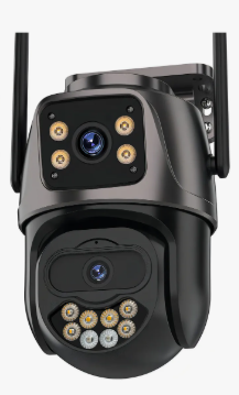 Sistema avanzado con doble lente que permite monitoreo panorámico y seguimiento automático de movimiento.